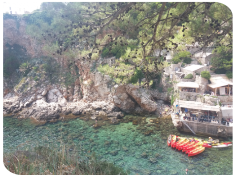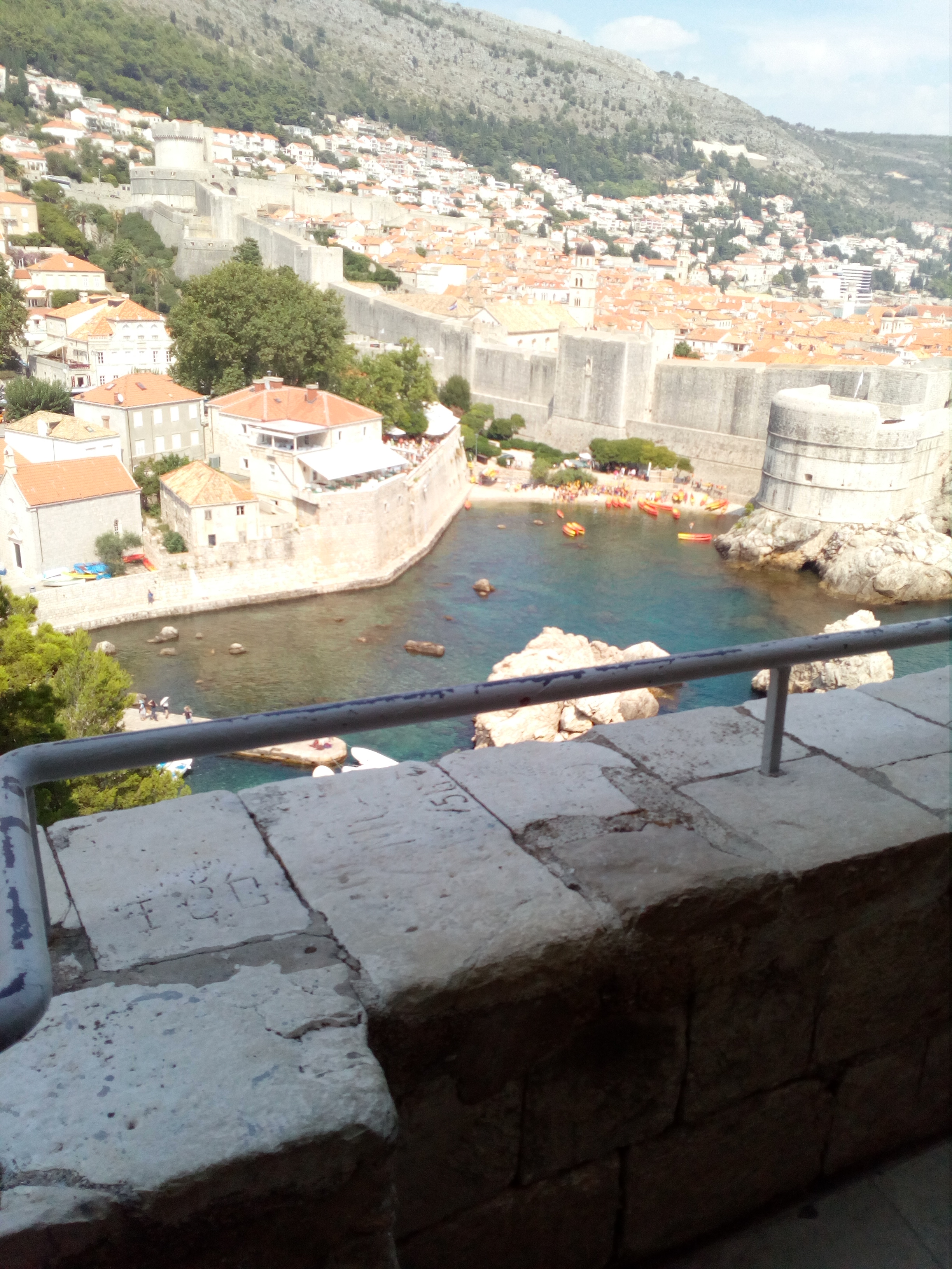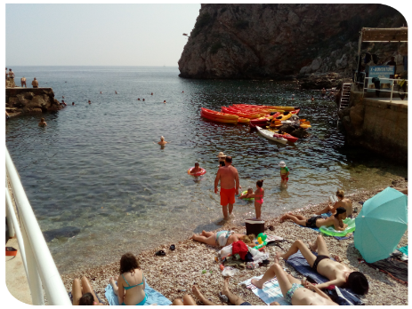 Kolejną wycieczką był wypad do Dubrownika. Trasa Klek-Dubrownik to trochę ponad 70 km i wiedzie przez kawałek Bośni i Hercegowiny. Na trasie panuje duży ruch i są przestoje choćby na granicy z Bośnią i Hercegowiną. Miasto Dubrownik jest naprawdę przepiękne ale zaparkować tam…. My krążąc po mieście w celu znalezienia bezpłatnego miejsca parkingowego w końcu odpuściliśmy i wjechaliśmy na parking podziemny, który trochę kosztuje ale za to przy samej starówce, która jest wpisana na Listę Światowego Dziedzictwa Kulturowego UNESCO. Dubrownik oprócz przepięknych zabytków ma naprawdę piękne plaże. Spacerując wąskimi uliczkami miasta przez przypadek na jedną z nich trafiliśmy (zdjęcie poniżej).